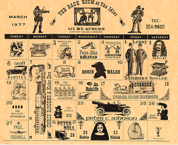 Idler Schedule 3/77 - Among others performers, Spider John Koerner, Paul Rishell, Peter Bell, Chris Rhodes and Lenny.